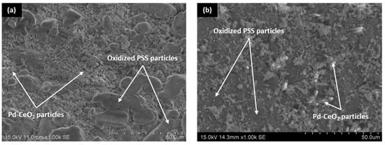 As can be seen, a large number of irregular pores typical in PSS remain after the initial calcination step in air at 600 °C (Figure 3a,b). A detailed analysis by image segmentation of both the porosity and average pore size after the support calcination revealed values of around 10% and 2.2 μm, respectively. However, it was still possible to find some pore mouths larger than 15 μm that could compromise the formation of a fully dense Pd-film of a few micrometers. These values are quite similar to those obtained on the external surface of analogous PSS supports after their calcination in air, and only represent a slight reduction compared with uncalcined ones [35]. Therefore, it can be stated that the generated oxide layer around each stainless steel particle was thin enough to avoid a drastic modification of the original surface morphology on the internal and external sides and further modifications are required to fabricate composite membranes with limited palladium thickness. In this context, the subsequent incorporation of Pd–CeO2 particles by PA-DC partially blocked most of the largest pores present in calcined PSS supports (Figure 3c,d), generating a new porous structure in which a relatively narrow distribution of pore-mouth sizes was reached. In fact, the largest pore mouths of the new surface remained below 3.5 μm with an average pore size of around 0.8 μm. In this manner, it was expected to obtain a thinner and fully dense Pd-film with a good continuity onto the new morphology, as suggested in previous works by Shi et al. [40] and Yepes et al. [41], among others.