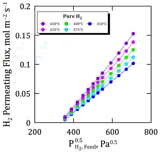 The obtained results under these conditions are summarized in Figure 6, where the permeating flux is plotted against the square root of the hydrogen partial pressure on the feed side. First, it should be noticed that, at higher pressure and temperature values, the flux profiles reveal a tendency to be more than linear, probably due to a non-ideal hydrogen permeation caused by the relatively high concentration in the metal lattice. However, this deviation is so slight within the selected range of pressures that the ideal permeation of hydrogen through the membrane can be assumed with a minimum error, as suggested by Caravella et al. [42].