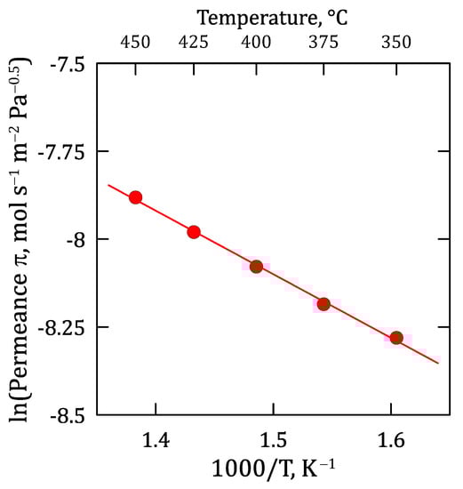 The detailed influence of operating temperatures during permeation experiments is shown in Figure 7 through a traditional Arrhenius-type plot, in which the H2-permeance is represented against the inverse of temperature. As usual, higher temperatures increase the reached H2-permeance through the composite Pd-membrane with a good linearity between both parameters, as evidenced by the satisfactory R-squared coefficient (R2 = 0.998). The goodness of fit measure for the linear regression suggests that the approximation made while considering Sieverts’ law within the experimental temperature range is reasonably acceptable.