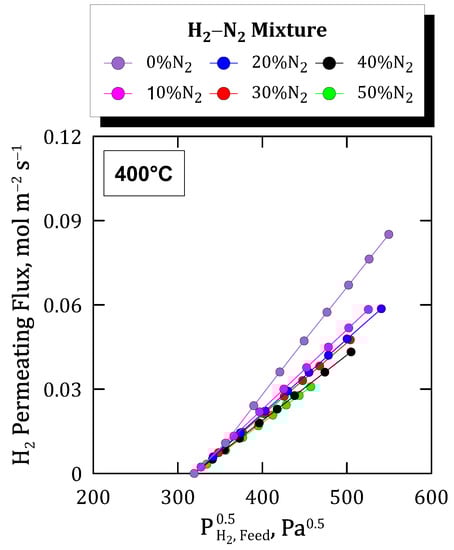 First, the analysis of permeation behavior when feeding binary H2–N2 mixtures, evaluated as individual gases in the previous section, is addressed. In this context, Figure 8 collects the permeating fluxes reached at 400 °C as a function of the square root of the hydrogen partial pressure in the feed. Each data series collects diverse nitrogen compositions in the feed while maintaining analogous pressure driving forces for each particular point.