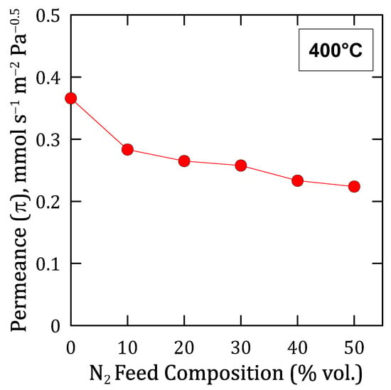 On the other hand, it should be noticed that all the flux trends were approximately linear, which allows us to evaluate precisely a Sieverts-type permeance for each composition. The evolution of these permeance values given under each particular condition is shown in Figure 9. As it can be seen, a continuous decreasing trend was produced for increasing nitrogen concentrations in the feed, being especially marked when comparing the permeation reached by feeding pure hydrogen with a binary N2–H2 mixture, even in the case of a relatively low nitrogen concentration. This behavior is typical in other similar Pd-based membranes and can be explained by the concentration-polarization effect described in multiple studies [28,51,52,53]. This effect, which negatively affects the overall permeation through the membrane, is a natural consequence of the high selectivity of the composite membrane. In this manner, the non-permeating species, nitrogen in this particular case, is accumulated onto the feed side of the Pd film, thus increasing its concentration at the boundary layer close to the palladium surface due to the selective transport of hydrogen through the precious metal [54]. This phenomenon, here evidenced for H2–N2 binary mixtures, will always occur for any other gas mixture, although its relevance could vary as a function of the particular properties of compounds present in the mixture, mainly their kinetic diameters. Moreover, the presence of a porous structure close to the surface, i.e., considering the use of any porous support, intermediate layer, or porous protective film for the palladium film, surely increases this phenomenon.