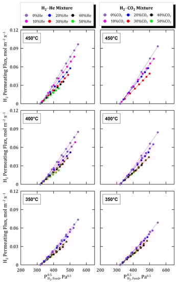 Considering the interest in elucidating possible differences while testing binary mixtures of hydrogen with other inert molecules of diverse kinetic diameters, as suggested in the previous section, new experimental campaigns were performed. These tests were similar to those previously addressed, although the amount of nitrogen (d = 3.64 × 10−14 m) in the mixture was replaced by helium (d = 2.60 × 10−14 m) or carbon dioxide (d = 3.30 × 10−14 m), both molecules with lower kinetic diameters. In addition, the experiments were performed at three different temperatures in the range of 350–450 °C to better analyze the membrane performance in different changing conditions. All the results obtained from these experimental campaigns are collected in Figure 10, where the permeation fluxes reached for a particular binary mixture are organized in columns while rows are dedicated to each particular temperature considered during the tests.