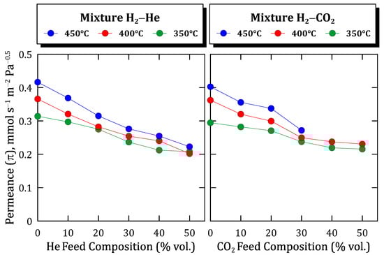 In addition to permeation tests with pure gases, the membrane performance was also analyzed for permeation with binary mixtures in which hydrogen was fed together with different non-permeating gases (N2, He, CO2 and CO) at diverse concentration values (0, 10, 20, 30, 40, and 50% vol.) and temperatures (350–450 °C) to investigate the influence of possible mass transfer resistances generated by the porous support itself, the concentration polarization effect, or potential inhibition effects of certain non-permeating compounds.