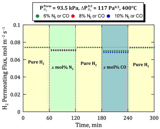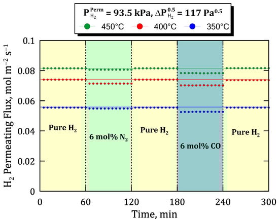 Previous experiments, in which binary mixtures containing relatively inert species were fed to the system, can be completed with other ones that could generate some inhibition, as occurs with carbon monoxide as widely reported in the literature [23,26,28]. To assess the potential inhibition effect produced by CO, the time profiles of permeate hydrogen flux are collected in Figure 12 for a specific hydrogen partial pressure on the permeate side ( = 93.5 kPa) and a certain value of Sieverts’ driving force ( = 117 Pa0.5) but different operating conditions in terms of temperature and feed composition. In this context, three different sets of experiments were carried out at temperatures ranging from 350 to 450 °C. In all of them, first, the system is fed with pure hydrogen, changing the stream each 60 min by adding alternatively 6 mol% of inert (N2) and an inhibiting species (in this case, CO). Between each mixture condition, pure hydrogen is tested again to verify the stability of the membrane.