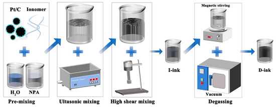 This section describes the procedures and instrumentation for the preparation of the HSC ink. Briefly, 5.7 g of Pt/C powder (Johnson Matthey, Alfa Aesar, Shanghai, China, Vulcan XC-72 with 60 wt% Pt and 20.5 g of Nafion® solution (Dupont™, New Castle, DE, USA, Nafion® PFSA polymer dispersions D-520) were mixed with 27 g of the NPA and ultrapure water (the ratio of NPA to ultrapure water was 1) dispersion medium. The process of fabricating the HSC catalyst ink followed the steps shown in Figure 1. Firstly, 5.7 g of catalyst powder was added to 13.5 g of water and stirred with a glass rod, and then 13.5 g of NPA and 20.5 g of Nafion solution were added successively (premixed process), followed by ultrasonic dispersion (35 kHz, 5 min, 15 °C). Secondly, the catalyst ink was homogenized by high-speed shear (1600 rpm, 30 min) and finally degassed using a magnetic stirrer at 30 rpm for 30 min at −0.1 MPa. The ink and raw material for the above process were contained in glass containers. The catalyst ink that was not degassed was measured after being kept for 24 h and marked as “I-ink”, whereas the degassed ink was denoted “D-ink” and left to stand for at least 24 h before subsequent measurement. After preparation of the two catalyst inks, the container was filled with nitrogen as the protective gas.