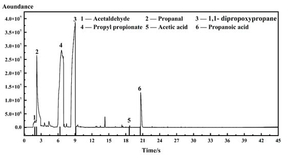 The impurities in the ink were indexed as acetaldehyde, propanal, 1,1-dipropoxypropane, propyl propionate, acetic acid, and propanoic acid. The corresponding regions of the TIC spectrum were detected after 1.865, 2.194, 9.136, 6.338, 18.620, and 20.562 s. The presence of acetaldehyde was confirmed by the fragment ions (m/z) at 29, 43, 44, and 15 (Figure 3), whereas the propanal segments were ionized into m/z of 26, 27, 28, 29, 57, 58, and 59. Other impurities were identified through additional analysis of the mass spectra, such as propyl propionate, 1,1-dipropoxypropane, acetic acid, and propanoic acid. Interestingly, these impurities were found to simultaneously occur in I-ink and D-ink, albeit with significant differences in concentrations. Therefore, the degassing treatment efficiently suppressed the oxidation process of the solvent. Previous studies have demonstrated that Pt metal can catalyze solvents to produce complex oxidizing compounds, including acetaldehyde, propanal, acetic acid, and propanoic acid [22,28,29]. These catalytic products are then condensed to form esters. We observed significant differences in impurity concentrations between I-ink and D-ink. It is worth noting that the oxidation products exhibited more hydrophobic characteristics than the original solvent composition. Nafion®, a binder and stabilizer in catalyst inks, is essential for optimization of the properties of catalyst inks [30]. In fact, its hydrophobic backbone is attracted to the hydrophobic surface of the carbon support, whereas its hydrophilic sidechains are ionized to generate numerous ionic charges on the surfaces of the carbon support [31]. However, the presence of hydrophobic impurities improved the compatibility between the ionomer and solvent, thereby increasing the amount of free ionomer on the solvent. Consequently, this affected the interaction between the internal components and rheology of the catalyst ink [16,32]. Next, we investigated the effects of the atmosphere and temperature on the impurity generation process.