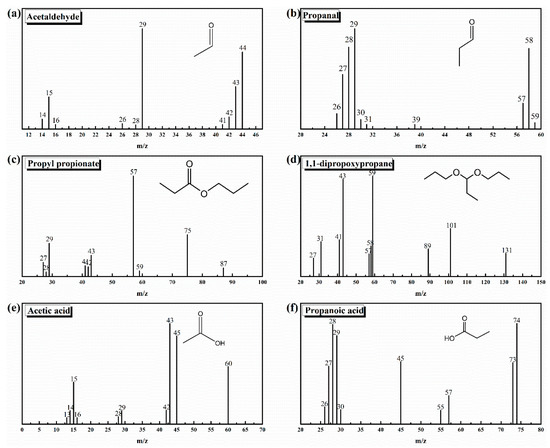 Mass spectra of impurities derived from electron impact ionization of I-ink: (a) acetaldehyde; (b) propanal; (c) propyl propionate; (d) 1,1-dipropoxypropane; (e) acetic acid; (f) propanoic acid.