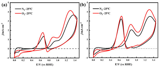 where QH (mC) is the charge of hydrogen species’ electro-adsorption peak; the value of 210 μC·cm−2 corresponds to monolayer adsorption of hydrogen atoms on a polycrystalline Pt; and mPt represents the mass load of Pt on the working electrode. ORR’s catalytic activity, which is the kinetic current density at 0.9 V (vs. the RHE) from the LSV curve, was calculated based on the Koutecky–Levich (K–L) equation as follows [26]: