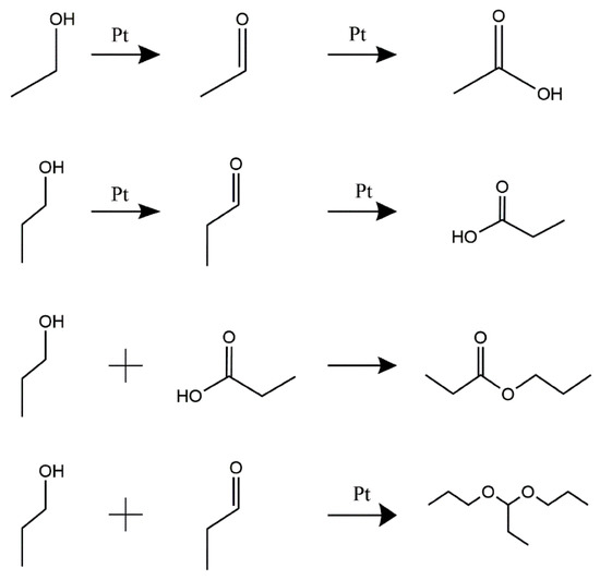The CV of Pt/C electrodes in 0.05 M H2SO4 + 0.1 M NPA solution at 0.002 V·s−1 shows the electro-oxidation process of NPA (Figure 4a). The first oxidation peak was detected at 0.90V vs. the RHE in the O2-purged solution, in the positive scanning process. In contrast, this peak was found at 0.95 V vs. the RHE in the N2-purged solution, due to the overpotential required to overcome the concentration polarization caused by the lack of O2. Both oxidation peaks corresponded to the poisonous intermediate formation in the NPA oxidation reaction [28]. However, an increase in the potential generated the second oxidation peak at 1.29 V in the O2-purged solution, whereas a similar peak was observed at 1.35 V in the N2-purged solution. This oxidation peak indicated the formation of reaction intermediates during NPA oxidation. Furthermore, several higher peaks’ current densities were recorded in the O2-purged solution relative to the N2-purged solution, because sufficient electro-oxidation of NPA produces a larger reaction current. A similar phenomenon was observed during the oxidation of alcohol (Figure 4b). The oxidation peaks’ current densities of NPA and EA are summarized in Table 3. The high impurity concentration of I-ink derived from quantitative analysis of GC-MS also supported this phenomenon (Table 2). As previously mentioned, the CVs of NPA and EA in the O2 atmosphere exhibited a significantly higher oxidation overpotential and smaller oxidation current density, suggesting that the anoxic environment can reduce the intensity of solvent oxidation reactions. The effects of the temperature on the electro-oxidation of NPA and EA are discussed in the Supporting Information, and the CVs of NPA and EA under various temperatures are shown in Figure S2. Summarily, high temperatures promoted the solvent’s oxidation behavior, suggesting the need to regulate the N2 atmosphere and control the temperature for an effective reduction in solvent electro-oxidation during the ink preparation process. A summary of the mechanism underlying the formation of impurities in the catalyst inks is shown in Figure 5. Briefly, EA and NPA can be oxidized to their respective aldehydes and acids, in the presence of platinum catalysis; meanwhile, propyl propionate is generated by esterification of propionic acid and propanol. Specifically, the aldolization reaction of NPA and propanal, via Pt catalysis, is the cause of 1,1-dipropoxypropane [14].