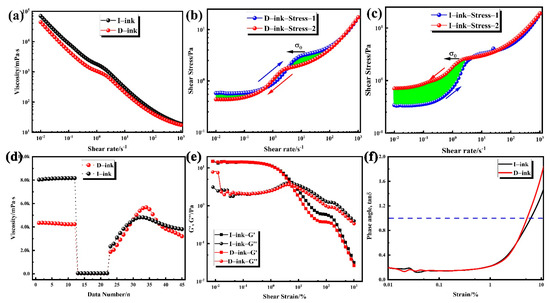 Next, we used oscillatory shear to investigate the inks’ microstructure, and amplitude sweep to characterize the inks’ linear viscoelastic regime (LVR). Subsequently, we applied the LVR to accurately measure the breakdown of the network structure and acquire the structural strength of the initial state [42]. The results reveal lower G″ values for both inks at the low-strain region compared to G′, indicating an elastic-dominant response property of the inks (Figure 6e) [42]. At a strain range of 5% to 7%, the G′ value fell below that of G″, indicating that only a slight increase in the shear strain could promote the inks’ shift from elastic-dominant to viscous-dominant [49]. The phase angle of the ink, which is calculated using Equation (4) below, is shown in Figure 6f.