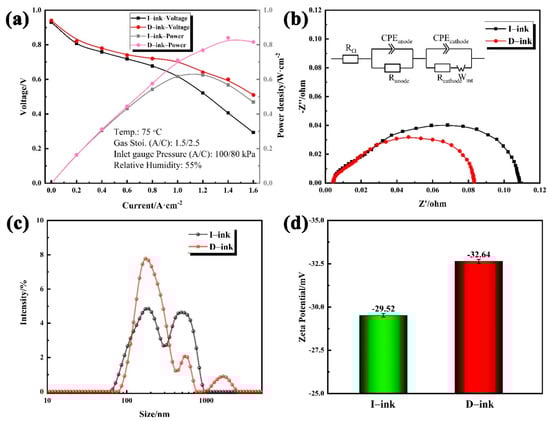 (a) H2/air polarization curves of membrane electrode assemblies fabricated with HSC inks, and (b) corresponding Nyquist plots obtained at 1.6 A∙cm−2 from 0.1 Hz to 1 kHz; (c) size distribution and (d) zeta potential of I-ink and D-ink.