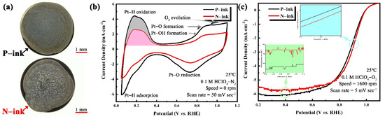 The CV curves of electrodes from N-ink and P-ink are shown in Figure 8b. The anodic H waves and the cathodic H waves in the CV represent the H from the electrochemical desorption and adsorption process, respectively [24,27,64]. The Hupd charge is estimated after the conventional correction for the pseudocapacity seen in the double-layer region by a straight line. As an electron is transferred during the oxidation of the adsorbed Hupd, the charge of Hupd is therefore given by with the potential E, the sweep rate v, and the current i. The amounts of Hdes in the curves of P-ink and N-ink, with double-layer charges subtracted, are 1.58 mC and 2.83 mC, respectively. In agreement with the report of Garsany et al. [24], the film quality affects the electrochemical surface area measurement, with an ECSA of 62.7 m2∙gPt−1 for the electrode fabricated from N-ink, compared to 112.2 m2∙gPt−1 for the electrode fabricated from P-ink (cf. Table 5—data from tables). Notably, the data shown in Figure 8c indicate that the electrode deposited by P-ink had a higher mass activity (84.4 mA∙mgPt−1) than that deposited by N-ink. Furthermore, the normal LSC ink exhibited lower electrochemical properties of electrode deposition than the LSC ink with propionic acid, under similar conditions of the catalyst ink formation and drying process. The superior catalyst performance of the N-ink electrode was attributed to the morphology of the deposited catalyst, due to the effect of impurities on the ink [65]. The records of the drying process for N-ink and P-ink are presented in the Supporting Information to reveal the drying behavior of the ink droplets on the glass substrate.