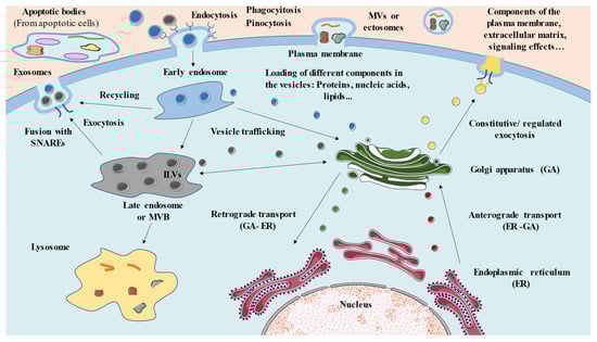Summary of the main parties involved in cellular and vesicular traffic. There is communication between the ER and the GA, where the vesicles are packed and classified, transporting different contents in both directions (anterograde and retrograde transport). Some of these vesicles are sent to the plasma membrane to be secreted by a process of constitutive or regulated exocytosis (mainly mediated by the SNARE complex). By endocytosis, different vesicles and substances from the medium are captured, entering the cell and forming the early endosome. The early endosome can recycle these components back to the cell exterior, send them to the GA, or give rise to a secondary endosome, also called multivesicular bodies (MVBs), as this structure contains multiple smaller vesicles known as intraluminal vesicles (ILVs). There is important communication between the GA and MVBs, yielding a bidirectional exchange of vesicles that can be secreted, giving rise to exosomes or becoming part of lysosomes for their subsequent degradation. Likewise, other types of extracellular vesicles, ectosomes or microvesicles (MVs), can be formed directly from the plasma membrane. It is noteworthy that each vesicle can have very diverse contents, including different types of proteins, lipids, and nucleic acids.