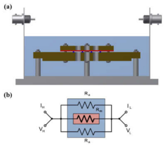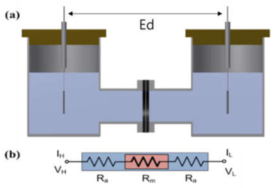 (a) Four-probe cell and (b) electric circuit: the cell immersed in a KOH solution. (VH: voltage high; VL: voltage low; IH: current high; IL: current low; Ra: ohmic resistance of an alkaline solution; Rm: ohmic resistance of a membrane coupon; Ed: electrode to electrode distance.)