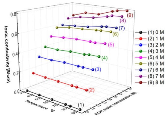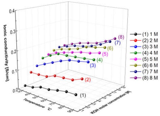Figure 5 presents the measured hydroxide ion conductivity of aqueous KOH solutions as a function of temperatures and concentrations using the conductivity meter (SevenExcellenceTM, Mettler Toledo, Columbus, OH, USA). With the increase in the temperature and the concentration, the hydroxide ion conductivity of aqueous KOH solutions tended to increase. The reason is that the amount of ions would increase with the increase in the concentration, and the mobility of ions would increase with the increase in the temperature, thus leading to an increase in ionic conductivity [31]. Comparing the increase rate of the ion conductivity, the increasing rate with the concentration was confirmed more significantly than the increase rate with the temperature. As revealed by the above results, the hydroxide ion conductivity of aqueous KOH solutions could be more dependent on concentration than temperature.