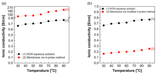 Figure 10a depicts the hydroxide ion conductivity measured using the four-probe method by immersing the test cell in the KOH solution. The resistance of the membrane was significantly lower and resulted in super-high hydroxide ion conductivity values, probably due to the hydroxide ions moving first and rapidly through the KOH solution rather than the membrane. However, as depicted in Figure 4, the modified cell was installed with a wetting membrane immersed in a specific KOH solution before the measurement and measured in the same four-probe method. Unlike the measurement as illustrated in Figure 3, there was a connection of a linear series resistor, and its total resistance is defined as Equation (4) [28]: