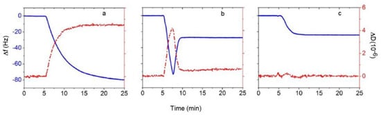 Figure 2. Typical QCM-D responses reflecting the three modes of vesicle–quartz crystal interactions shown in Figure 1. The blue lines are frequency changes with the scale represented on the left axis and the red lines are dissipation changes with the scale represented on the right axis. (a) Adsorption of vesicles and formation of a layer of vesicles. (b) Adsorption of vesicles followed by their rupture at a critical vesicular coverage and formation of SLB. (c) Formation of SLB as soon as the vesicle contacts the substrate. The figures are examples taken from reference [20]. Copyright Jackman et al, Langmuir, 2013.