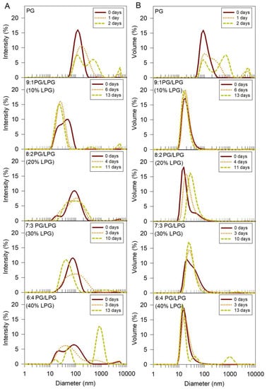 Figure 4. Size distribution of PG and PG/LPG vesicles in order of increasing LPG percentage. The intensity (A) and volume (B) size distributions were determined using DLS. Size distributions at three time points are presented for each vesicle type to observe the relative stability of the vesicles against aggregation over time.