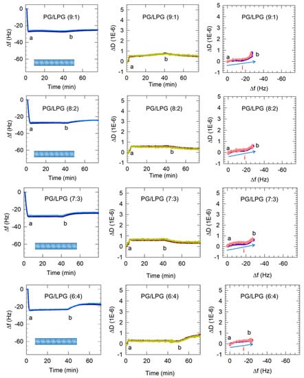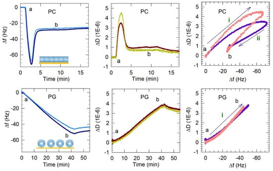 There is also a non-vanishing ΔD (the second term in the expression) accompanying the film deposition as shown in Equation (A3). An increase in ΔD corresponds to a decrease in the storage modulus G′ and indicates a less rigid, possibly more disordered film. A decrease in ΔD corresponds to an increase in the storage modulus and indicates a more rigid film on the crystal surface. In experiments involving supported lipid bilayers (SLBs), ΔD can also provide information about changes in the structure and ordering of the lipids. Disruption of the membrane will cause the lipids to become less ordered and potentially allow more water to associate with the membrane, increasing the film’s hydration and ΔD values.
