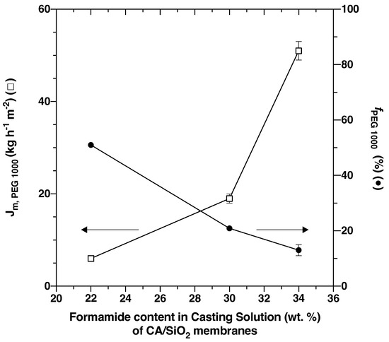 Analogously to what has been evidenced for conventional wet-phase inversion CA membranes [36,37], formamide acts as an enhancing pore-forming agent and the increasing formamide content in the casting solution of 22, 30 and 34 wt.% corresponds to membrane permeate mass fluxes of , and kg h m, and apparent rejection coefficients to PEG 1000 of , and , respectively.