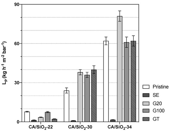 The membranes subjected to a solvent exchange post-treatment show a drastic decrease in the hydraulic permeabilities and of their corresponding s, and this may be due to a strong pore shrinkage. On the other end, the post-treatments of conditioning the membranes with surfactant solutions yielded less-pronounced alterations of their hydraulic permeabilities and s. However, the effect of the G20, G100 and GT post-treatments resulted differently in the less permeable membranes, CA22/SiO2-22, than in the more permeable ones, CA/SiO2-30 and CA/SiO2-34. In fact, in the last ones, there is a general increase in s and s. In contrast with that, the CA/SiO2-22-G20, CA/SiO2-22-G100 and CA/SiO2-22-GT membranes have lower values of s and s when compared to the values of the corresponding pristine membranes.