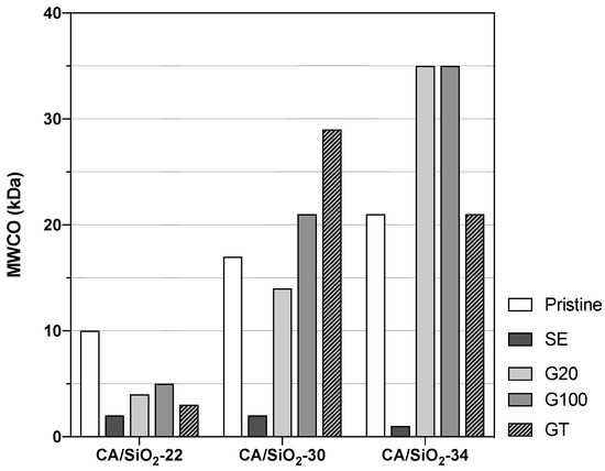 The following are available online at https://www.mdpi.com/article/10.3390/membranes12060559/s1. Figure S1: Variation of the apparent rejection coefficient, f, with neutral organic solute molecular weight and determination of the MWCO for the CA/SiO2-22 membranes. Figure S2. Variation of the apparent rejection coefficient, f, with neutral organic solute molecular weight and determination of the MWCO for the CA/SiO2-30 membranes. Figure S3. Variation of the apparent rejection coefficient, f, with neutral organic solute molecular weight and determination of the MWCO for the CA/SiO2-34 membranes.