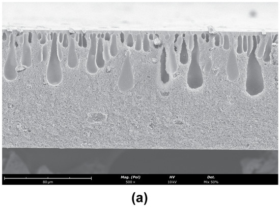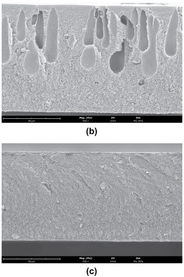 SEM images of the cross-sections (magnification ) of (a) CA/SiO2-22-SE, (b) CA/SiO2-30-SE and (c) CA/SiO2-30-SE. The active layer is located at the top surface of the membrane.