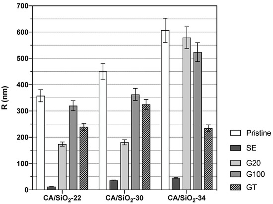 From Figure 10, it is possible to see a general increase in the average radial length of the water channels as one moves from membranes CA/SiO2-22 to CA/SiO2-30 and to CA/SiO2-34 and the corresponding ones after SE, G20, G100 and GT post-treatments. These results go along with the permeation data obtained that evidenced an increase, progressively, in the convective permeation properties.