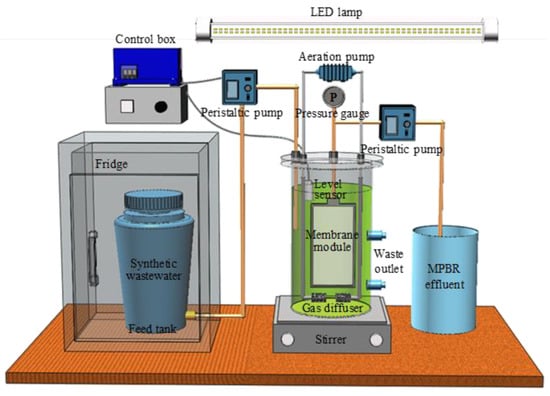 26. Zhang, M.; Leung, K.-T.; Lin, H.; Liao, B. The biological performance of a novel microalgal-bacterial membrane photobioreactor: Effects of HRT and N/P ratio. Chemosphere 2020, 261, 128199. [Google Scholar] [CrossRef]