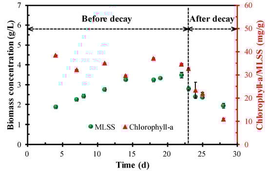 The contents of the microalgal biomass (represented by MLSS) and chlorophyll-a/MLSS are shown in Figure 2. During the period before the decay occurred, the microalgal biomass in the MPBR gradually increased and reached 3.48 g/L on day 22. Unlike the biomass concentration, the chlorophyll-a/MLSS content remained relatively stable and the average value was 34.44 ± 3.23 g/L. The gradual increase in microalgal biomass and relatively stable content of chlorophyll-a suggested that MPBR operated in a stable manner in the first 22 days. When the microalgae decayed on day 23, the biomass concentration and chlorophyll-a/MLSS dropped rapidly from 3.48 to 1.94 g/L and 34.56 to 10.71 mg/g, respectively, within 5 days. The rapid decrease in biomass concentration and chlorophyll-a/MLSS indicated that a large number of microalgae died in a short time.