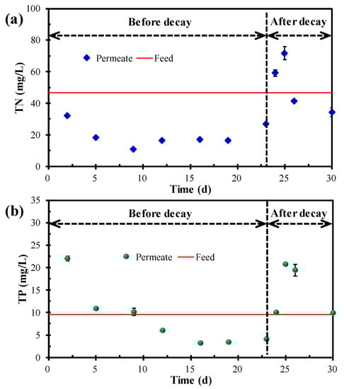 Figure 3. Variation in (a) TN and (b) TP in the feed and permeate.