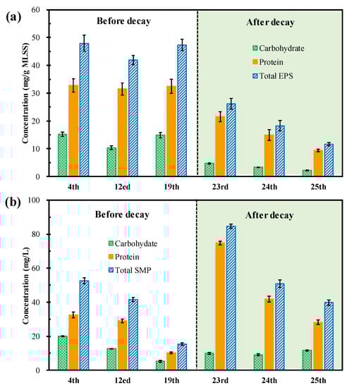 Figure 6. Comparison of the (a) EPS and (b) SMP content before and after decay.