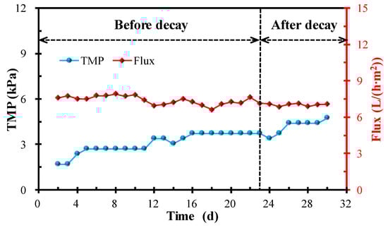 The variations in TMP and flux for the MPBR system are displayed in Figure 7. It can be seen that the flux remained relatively constant and the TMP gradually increased with little fluctuation during the whole experimental period. The TMP increased from 1.69 kPa to 3.72 kPa before microalgae decay and then gradually reached 4.74 kPa after microalgae decay. Overall, there is no significant increase in TMP after the occurrence of decay. As stated above, the flocs size and EPS content exhibited the opposite effect when compared with the SMP content for the membrane fouling formation. The small rise in TMP further demonstrated that membrane fouling formation is the comprehensive interaction results of various factors.