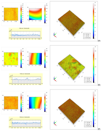 (A)—Rough surface of SCa4 sample—Rt = 33.813 µm; (B)—Glossy surface of SCa4 sample—Rt = 30.117 µm; (C)—Rough surface of SAA1 sample—Rt = 49.865 μm; (D)—Glossy surface of SAA1 sample—Rt = 34.987 µm; (E)—Rough surface of Control sample—Rt = 70.335 µm; (F)—Glossy surface of control sample—Rt = 38.357 µm.