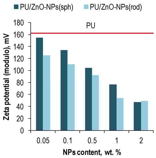 According to the zeta potential measurements (Figure 3), the negative charge in the polymer solutions was declined due to loading ZnO-NPs. Moreover, the charge drop was more noticeable for the rod-shaped NPs in contrast to the spherical ones. However, in all cases, the value of the zeta potential did not decrease below 25 mV modulo, so, it could be concluded that the ZnO-NPs are well resistant to agglomeration in the polymer solutions and the latter have a high degree of stability [].