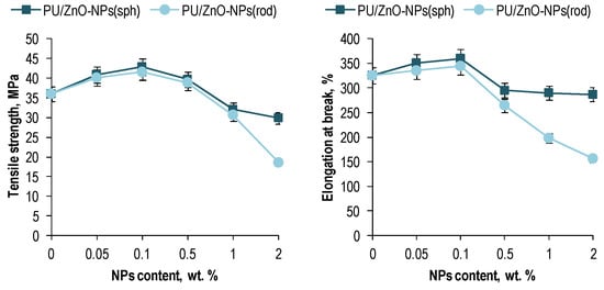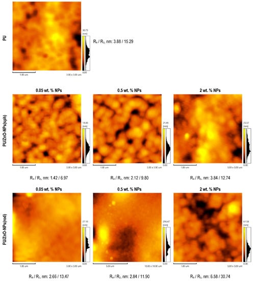 As a result, the following series of samples was obtained: PU (without adding ZnO-NPs), PU/ZnO-NPs(sph) in the case of the spherical NPs, and PU/ZnO-NPs(rod) in the case of the rod-shaped ones with ZnO-NPs loadings of 0.05, 0.1, 0.5, 1, and 2 wt. %.