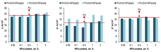 With loading spherical ZnO-NPs into the PU matrix, a decrease in the polar surface energy component was observed with a minimum at 0.5 wt. % of the NPs. The same minimum was observed with loading the rod-shaped ZnO-NPs. However, the maximum values slightly exceeded the values of the polar energy for the pure PU membrane.