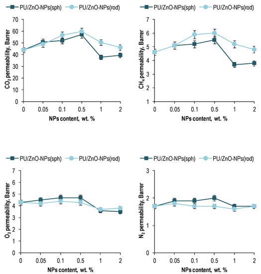 However, the changes in the membrane densities should also be taken into account (Table 4). The density of the membranes with the loading rod-like ZnO NPs into the PU matrix exhibited greater degradation than in the case of the spherical ones. This fact could been a reason of the higher CO2 and CH4 permeability values observed with the loading rod-like ZnO NPs. The opposite tendency for the O2 and N2 permeabilities could been observed due to the larger molecule kinetic diameter of these gases (Table 5) compared to CO2 and the lower propensity to site-specific interactions compared to CH4.