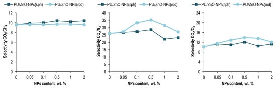 As a result of the different degrees of the changes in the permeability with the ZnO NPs loading into the PU matrix, the membranes’ selectivity increased after modification (Figure 7). For both forms of the NPs, the growth peak occurred at 0.5 wt. % NPs loading. It is noteworthy that, the largest increase was observed for CO2/CH4 in the case of the spherical ZnO-NPs and amounted to 8%. In the case of the rod-like ZnO-NPs, the CO2/CH4 selectivity remained virtually unchanged. However, the CO2/N2 and CO2/O2 selectivities of the PU/ZnO-NPs(rod) membranes increased by 36%, as well as ones increased by 10% and 19%, respectively, in the case of the spherical NPs.