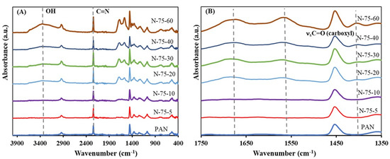The complete ATR-FTIR spectra of PAN-NaOH membranes heated to 75 °C are shown in Figure 1A). Pristine PAN membranes showed bands at 2940 cm−1 that corresponded to an asymmetric stretch of CH (ν-CH) in CH2 or CH3 groups, the band at 2242 cm−1 corresponded to the stretching vibration of the nitrile bond (ν-C≡N) and the band at 1452 cm−1 corresponds to the bending vibration of CH (δ-CH) in the CH2 groups [34,35].