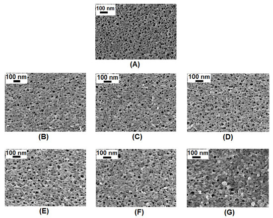 SEM images of the surface of (A) pristine PAN membrane and PAN-NaOH modified for (B) 5 min, (C) 10 min, (D) 20 min, (E) 30 min, (F) 40 min and (G) 60 min.
