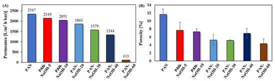 (A) Initial permeance compared to the (B) porosity of PAN-NaOH membranes modified for 5, 10, 20, 30, 40 and 60 min.