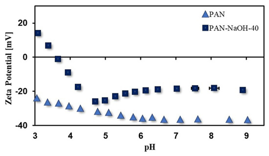 According to the ATR-IR spectra, the PAN-NaOH-40 membrane had the highest degree of modification as well as a high water permeance, and therefore as a next step, the zeta potential of this membrane was analyzed. The zeta potential graphs of pristine PAN and PAN-NaOH-40 membranes are shown in Figure 4. It could be observed that the zeta potential of pristine PAN membrane was completely negative in the pH range from 9 to 3. It ranged from −37 mV at pH 9 to −22 mV at pH 3. No IEP was observed in this pH range. The surface charge was negative due to the adsorption of hydroxyl ions on the membrane surface [38]. The surface charge of the modified membranes increased. The PAN-NaOH-40 membrane had a surface charge ranging from −19 mV to 20 mV with an IEP at pH 3.6. The IEP was present due to the protonation of COO- to COOH. A similar IEP was also reported by Muthumareeswaran et al. [10].