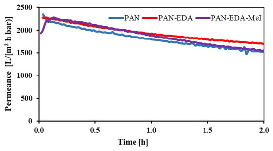 The permeance of the PAN-EDA membrane (Figure 6) suggested that the structure of the membrane did not vary much since it had a similar trend as the pristine PAN membrane. The initial permeances of pristine PAN, PAN-EDA and PAN-EDA-MeI membranes were 2350 L/(m2 h bar). The same was observed for PAN-EDA-BrBu and PAN-EDA-BrO (see Figure 3). As already mentioned, the permeance decreased with time due to the swelling of the membrane in water.