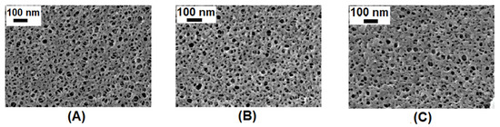 SEM images of the surface of (A) pristine PAN, (B) PAN-EDA, (C) PAN-EDA-MeI membranes.