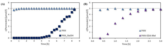 Once the membranes showed potential to adsorb oppositely charged substances, adsorption experiments using a toxic heavy metal cation (Cu2+) and a toxic anion (CrO42−) were performed. The results of these adsorption experiments are shown in Figure 10. The negatively charged PAN-NaOH-40 membrane (Figure 10A) adsorbed Cu2+ from the feed almost completely for 4 h. After 4 h the concentration of Cu2+ in the permeate slowly increased. After 8 h, the adsorption capacity of the membranes was reached, and therefore, the concentration of Cu2+ in the feed and the permeate was the same. The positively charged membrane PAN-EDA-MeI (Figure 10B) was able to adsorb CrO42−. However, the adsorption capacity of the membrane was attained much faster than the negatively charged membrane. The chromate concentration in the permeate was zero for only 20 min, after which, the concentration of CrO42− increased. After 2 h, the PAN-EDA-MeI membrane did not adsorb any further chromate.