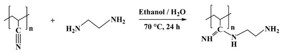The reaction equation of PAN with EDA is shown in Scheme 2. The preparation of the PAN-EDA membrane was performed through a modified synthesis from El-Newehy [30] and Glass et al. [31]. Pristine PAN membranes of 75 mm diameter were used (0.38 g; 7.2 mmol monomer units). The pristine PAN membrane was placed in a flask and the solvent (100 mL ethanol and 20 mL distilled water) was added. Then a 10-fold molar excess of EDA (72 mmol) compared to PAN was added to the reaction mixture. The reaction mixture was then heated to 70 °C and stirred at 250 rpm. The reaction was carried out for 24 h. After the completion of the reaction, the PAN membranes were taken out and washed with ethanol for 30 min twice and then with distilled water (30 min). The washed membranes were then dried overnight at 60 °C under vacuum.