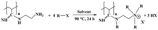 The general reaction scheme for the quaternization reaction of the PAN-EDA membrane is shown in Scheme 3. The alkyl halides (R-X) used were methyl iodide (CH3I), 1-bromobutane (1-C4H9Br) and 1-bromooctane (1-C8H17Br).