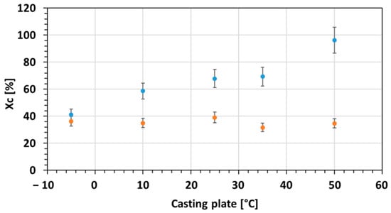 Crystallinity degree of neat PEBAX (Blue) and MMMs (Orange) according to the casting plate temperature (PA phase).