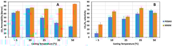 Variation of CO2 permeability (A) and CO2/N2 selectivity (B) as a function of the casting temperature for neat PEBAX (Blue) and MMMs (Orange).